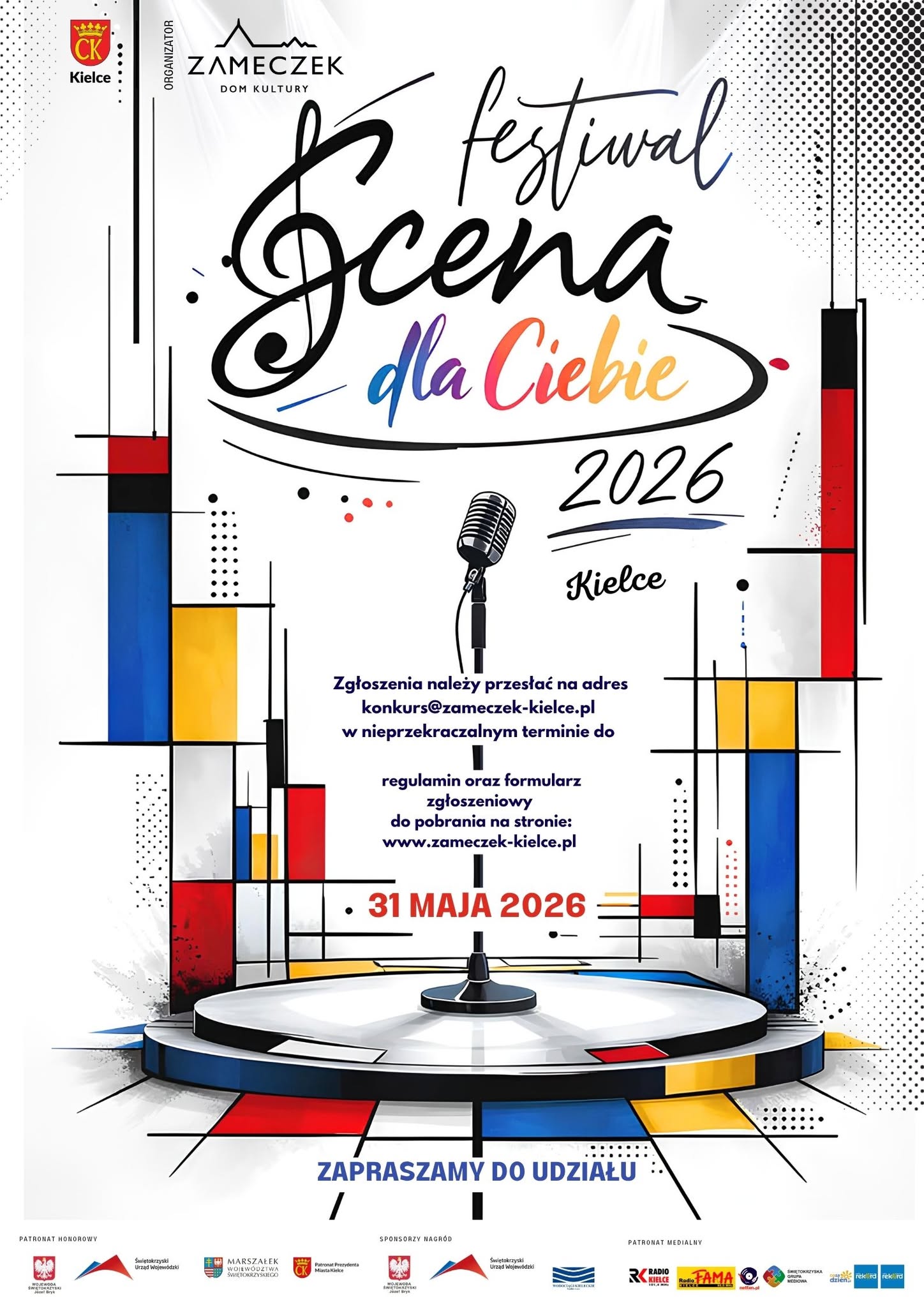Zapraszamy do udziału w Ogólnopolskim Festiwalu „Scena dla Ciebie” – Kielce 2026, który gromadzi utalentowanych artystów z całej Polski. To wyjątkowa okazja, by zaprezentować się przed publicznością, zdobyć cenne doświadczenie i spotkać ludzi z pasją!